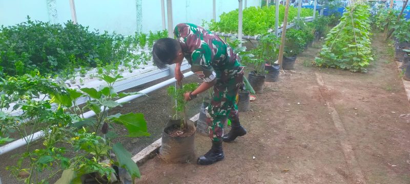 TAKALAR – kupastuntas86.com|Personel Piket Makodim dan tiap-tiap Koramil Jajaran Kodim 1426/Takalar, tampak sedang merawat tanaman yang memanfaatkan lahan kosong dengan menanami tanaman produktif. Halaman Kantor Kodim dan Koramil disulap menjadi lahan pertanian dengan membuat bedengan/rak polibag, kandang ayam petelur dan Kolam ikan yang diisi dengan berbagai jenis tanaman dan ikan. Sabtu, (13/09/2025)