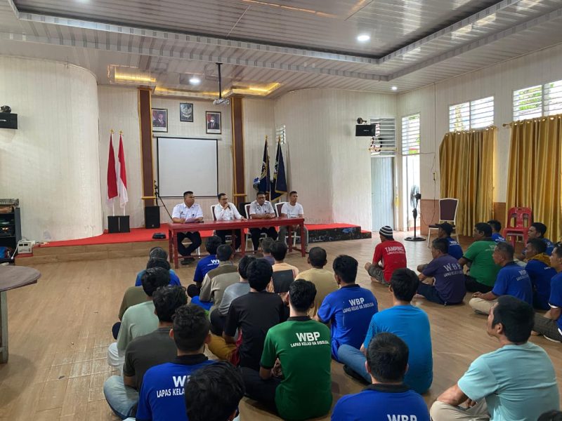Sibolga – Kepala Kesatuan Pengamanan Lembaga Pemasyarakatan Kelas IIA Sibolga, Ibnu Taqwim, didampingi Kasubsi Bimkemaswat Alberto Simanjuntak, Kasubsi Keamanana Joky Siallagan, dan Kasubsi Peltatib Andi Manalu, memberikan pengarahan kepada warga binaan yang akan diangkat sebagai Tamping, Rabu (17/09/2025). Kegiatan berlangsung di Aula Sahardjo Lapas Sibolga.