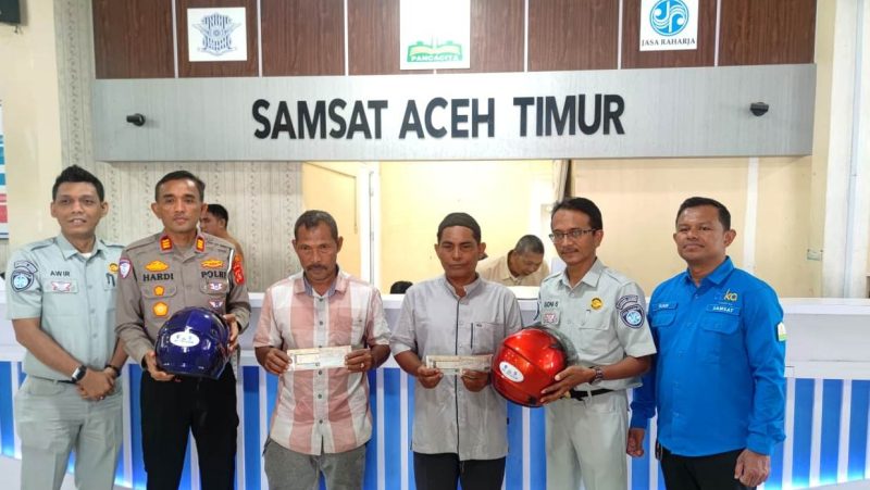 Aceh Timur | www.kupastuntas86.com – Dalam rangka memperingati Hari Keselamatan Lalu Lintas dan Angkutan Jalan (LLAJ) Nasional yang diperingati setiap tanggal 19 September, Satlantas Polres Polres Aceh Timur, Polda Aceh berkolaborasi dengan PT Jasa Raharja Cabang Langsa, dan UPTD Samsat Aceh Timur menggelar do’a bersama dan membagikan helm gratis kepada para wajib pajak yang taat membayar pajak kendaraan bermotor.