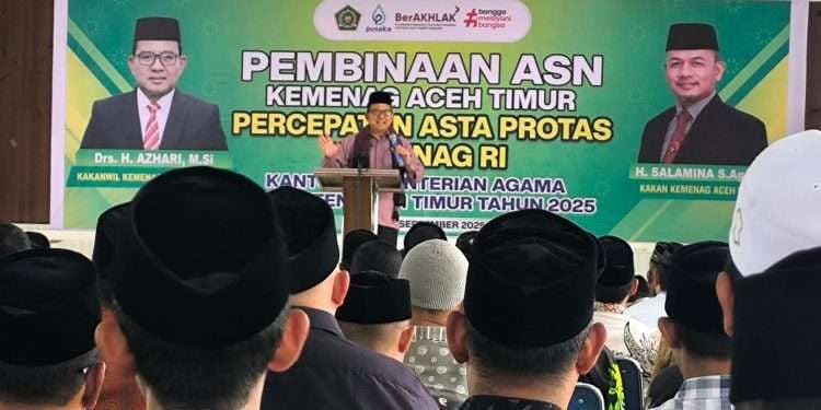 Aceh Timur – Kepala Kantor Wilayah Kementerian Agama Provinsi Aceh, Drs. H. Azhari, M.Si., mengimbau seluruh Aparatur Sipil Negara (ASN) di jajaran Kemenag Aceh menyukseskan Delapan Program Prioritas (Asta Protas) Kementerian Agama secara konsisten dan berkesinambungan.