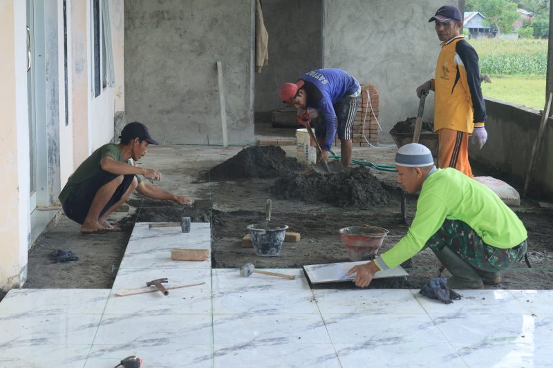 Prajurit TNI terlihat antusias berbaur dengan masyarakat, memasang keramik lantai, dan melakukan pekerjaan renovasi, mulai dari perbaikan lantai hingga pengecatan tembok masjid.