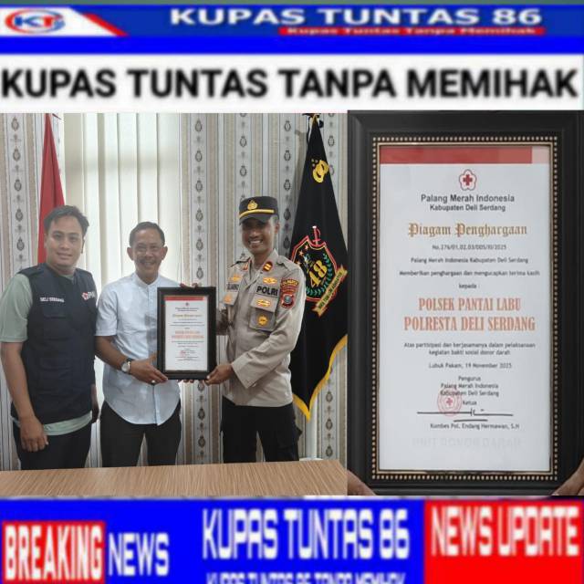 PANTAI LABU | Kupastuntas86.com – Polsek Pantai Labu Polresta Deli Serdang menerima Piagam Penghargaan dari Palang Merah Indonesia (PMI) Kabupaten Deli Serdang atas partisipasi dan kerjasamanya dalam pelaksanaan kegiatan bakti sosial donor darah. Penghargaan ini menjadi istimewa karena merupakan kali pertama PMI Deli Serdang melaksanakan kegiatan donor darah di Kecamatan Pantai Labu.