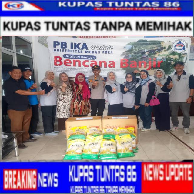 PANTAI LABU | Kupastuntas86.com – Bencana banjir yang melanda Desa Tengah Kecamatan Pantai Labu, Kabupaten Deli Serdang, beberapa waktu yang lalu telah menyentuh hati banyak pihak. Dampak yang ditimbulkan cukup parah, membuat banyak warga harus mengungsi sementara dan kesulitan memenuhi kebutuhan dasar. Salah satunya yang turut berperan meringankan beban para korban adalah Pengurus Besar Ikatan Alumni Universitas Medan Area (IKA UMA) melalui penyaluran bantuan sosial (bansos) yang penuh dengan kepedulian. Senin (8/12/2025).