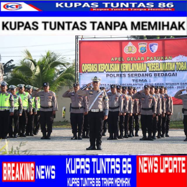 SERGAI| Kupastuntas86.com – Polres Serdang Bedagai menggelar Apel Gelar Pasukan Operasi Keselamatan Toba 2026 di lapangan apel Mapolres Serdang Bedagai, Senin (2/2/2026) pagi. Kegiatan yang dimulai pukul 08.00 WIB itu menandai dimulainya operasi kepolisian kewilayahan yang bertujuan meningkatkan kesadaran dan disiplin masyarakat dalam berlalu lintas.
