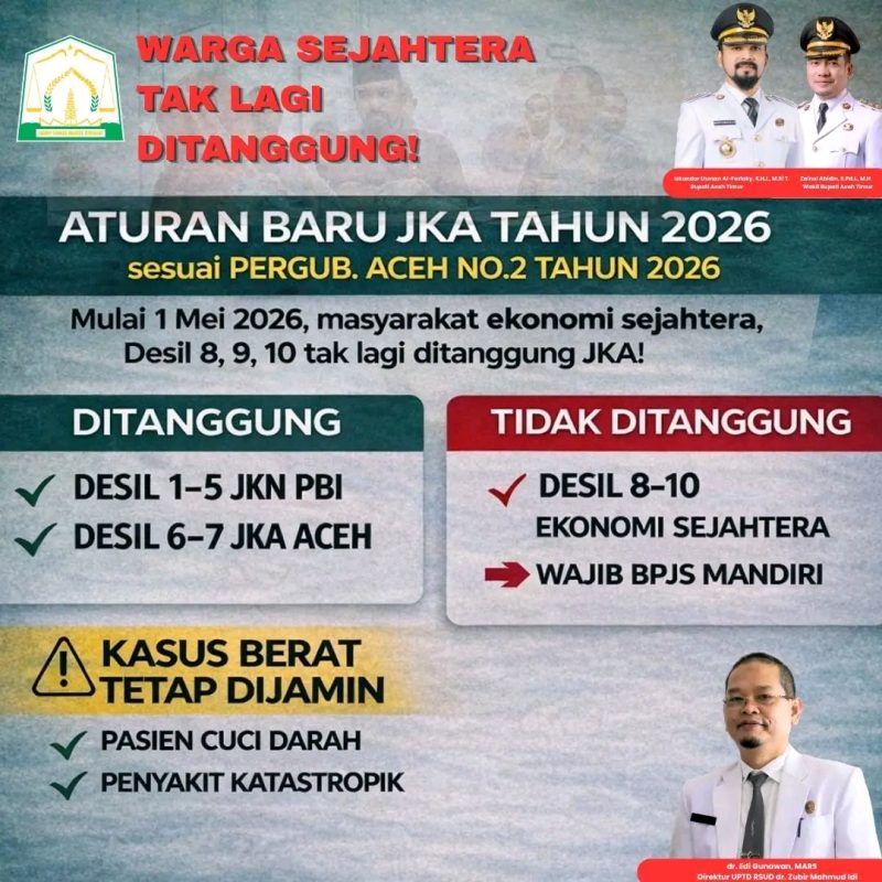 Ia menyebutkan kebijakan tersebut merupakan tindak lanjut pemberlakuan Peraturan Gubernur Aceh Nomor 2 Tahun 2026 yang mengatur tentang penyesuaian JKA.