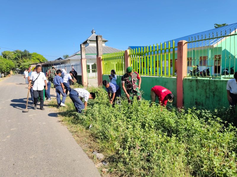Wujudkan Lingkungan Bersih, Personel Koramil 1426-04/Galesong Kerja Bakti Bersama Siswa SMU dan SMP