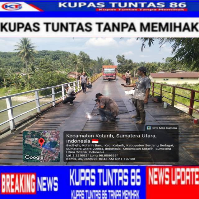 SERGAI | Kupastuntas86.com – Pada hari Kamis, 30 April 2026 skp 09.00 Wib, Kapolres Serdang bedagai AKBP Jhon Sitepu, SIK, MH, melalui Kapolsek Kotarih AKP PARGAULAN MANURUNG SH, melakukan perbaikan Jembatan Titi Paku yang merupakan jembatan utama penyeberangan penghubung antara kec. Galang kab. Deli Serdang dengan Kec. Kotarih Kab. Serdang Bedagai